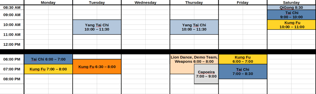 6:00 – 8:00 PM Thursday – Lion Dance & Demo Team, Weapons; CONDITIONING